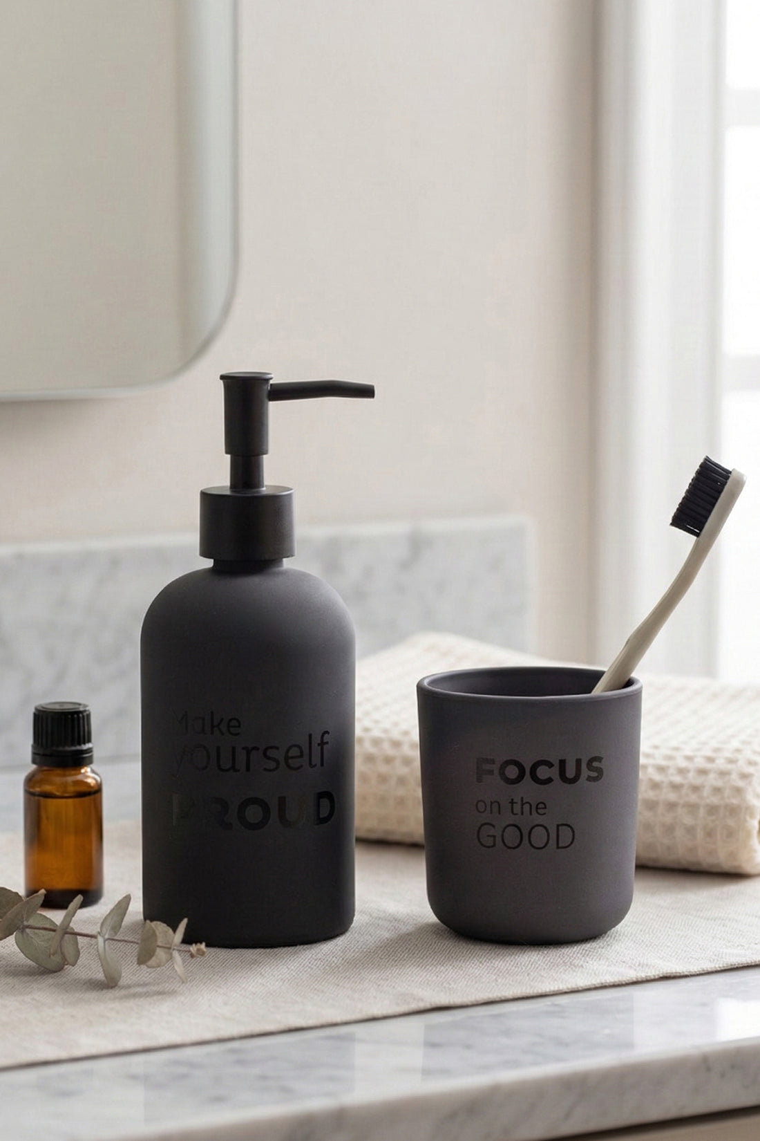 Diş fırçalık ve sıvı sabunluk banyo setleriyle banyonuza düzen ve estetik kazandırın. Modern tasarımlar sizi bekliyor!